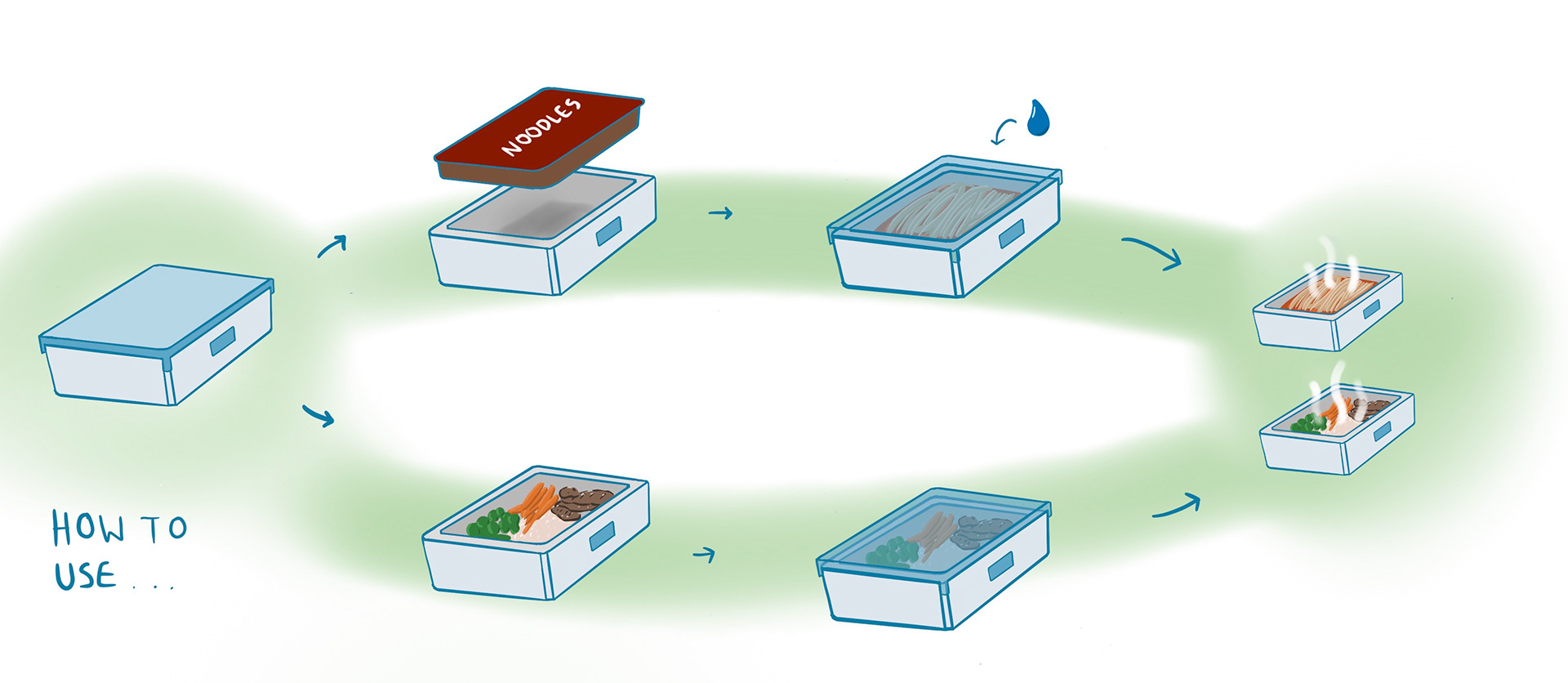 The final iteration of the lunch box focused on solving the previous problems. For easy charging and cleaning the battery separates from the outer liner. The single-press button cycles through three modes, on/off, warming mode, and heating mode. This container system was also designed to accommodate meal prepping. The user could bulk pack multiple containers and then just pop one in the outer liner and secure the containers with the strap. There's no need to repack the food or worry about it getting cold.